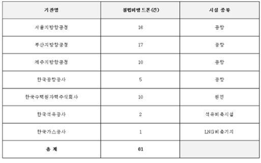 이용호 국회 국토교통위원회 의원이 지방항공청과 관계기관에서 제출받은 자료를 종합한 결과, 원전?공항?석유비축시설 주변 불법 드론 비행발생건수가 61건 이상이었다. 이 중 심각한 위협이 된 경우는 공항 2건과 원전 7건으로 파악됐다.