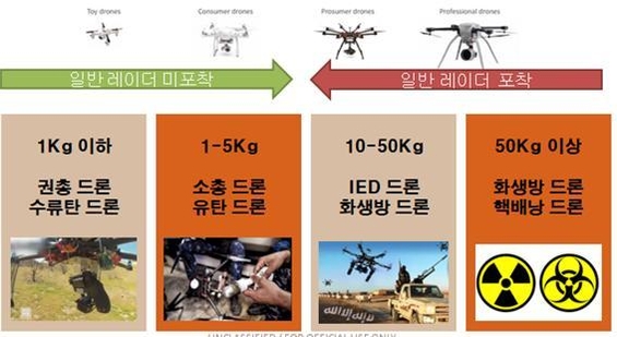 우크라이나에서는 일부 민수용 고정익(동체에 날개가 고정된 비행체로서 회전익기를 제외한 전(全) 비행체)과 멀티 콥터를 이용해 폭탄을 투하하거나 급조폭발물(IED)을 운반하는 등 전쟁에 활용하면서 위협이 됐다. 이제는 대형 민간 항공기가 이착륙하는 공항에서 문제를 일으키는 등 우리 일상 생활속에서 미확인 드론의 위협은 커졌다.